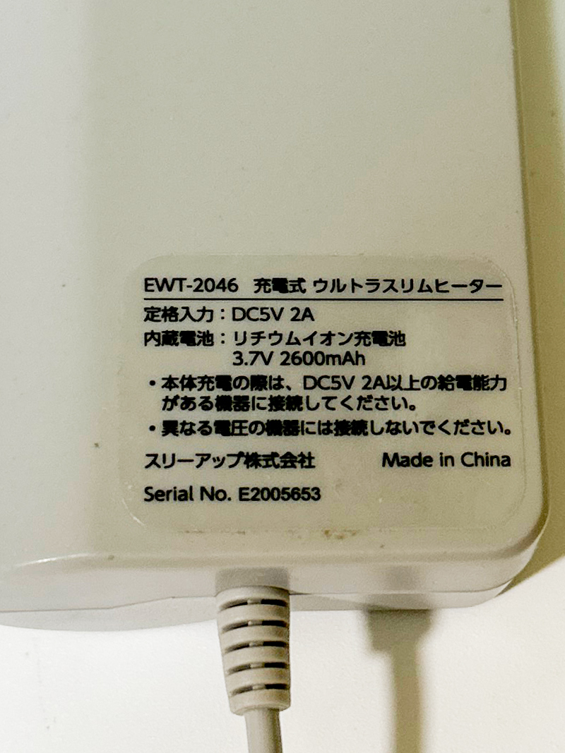 スリーアップ EWT-2046 充電式ウルトラスリムヒーター 極薄1mm コードレス