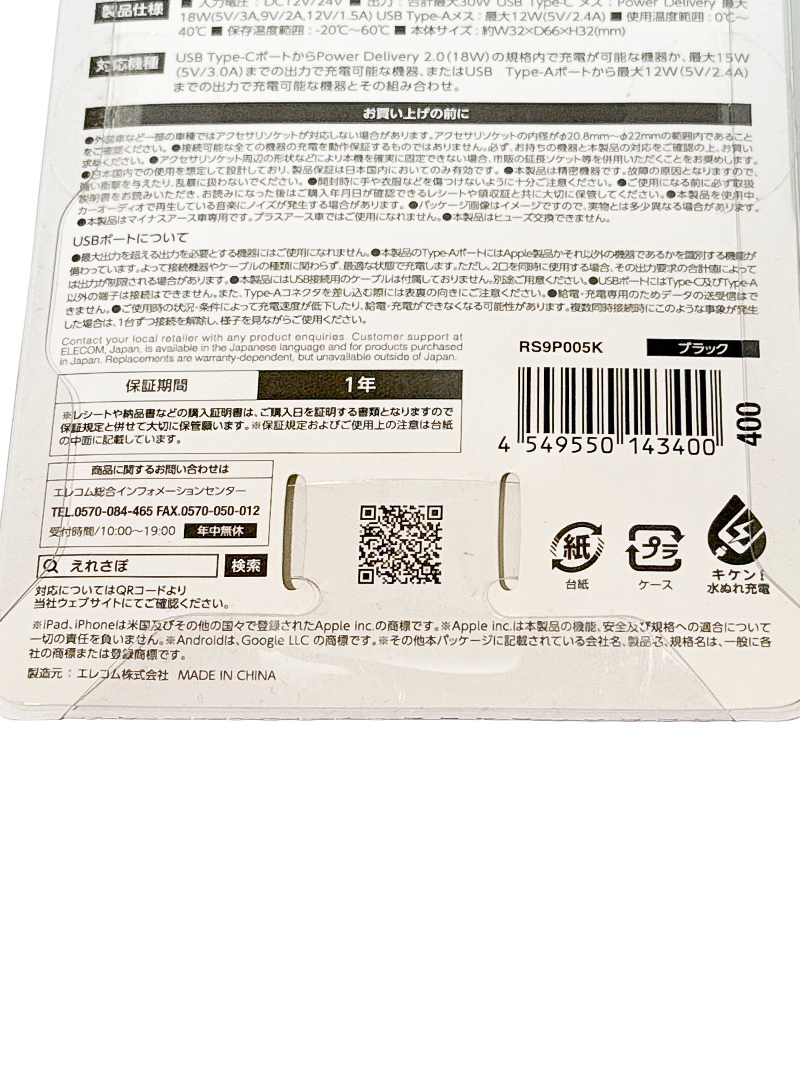 エレコム 車載充電器 USB PD準拠・30W・Type-Cポート&1ポート シガーチャージャ ブラック RS9P005K 新品