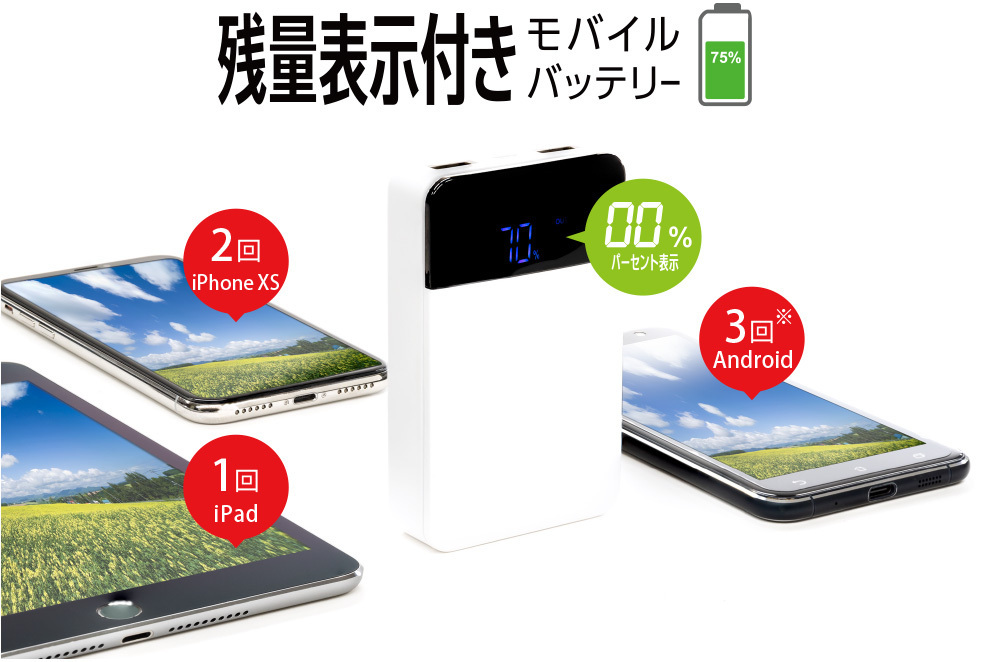 高出力5V2.1Aに加え、残量がパーセントで表示されるなど拘りの逸品!!