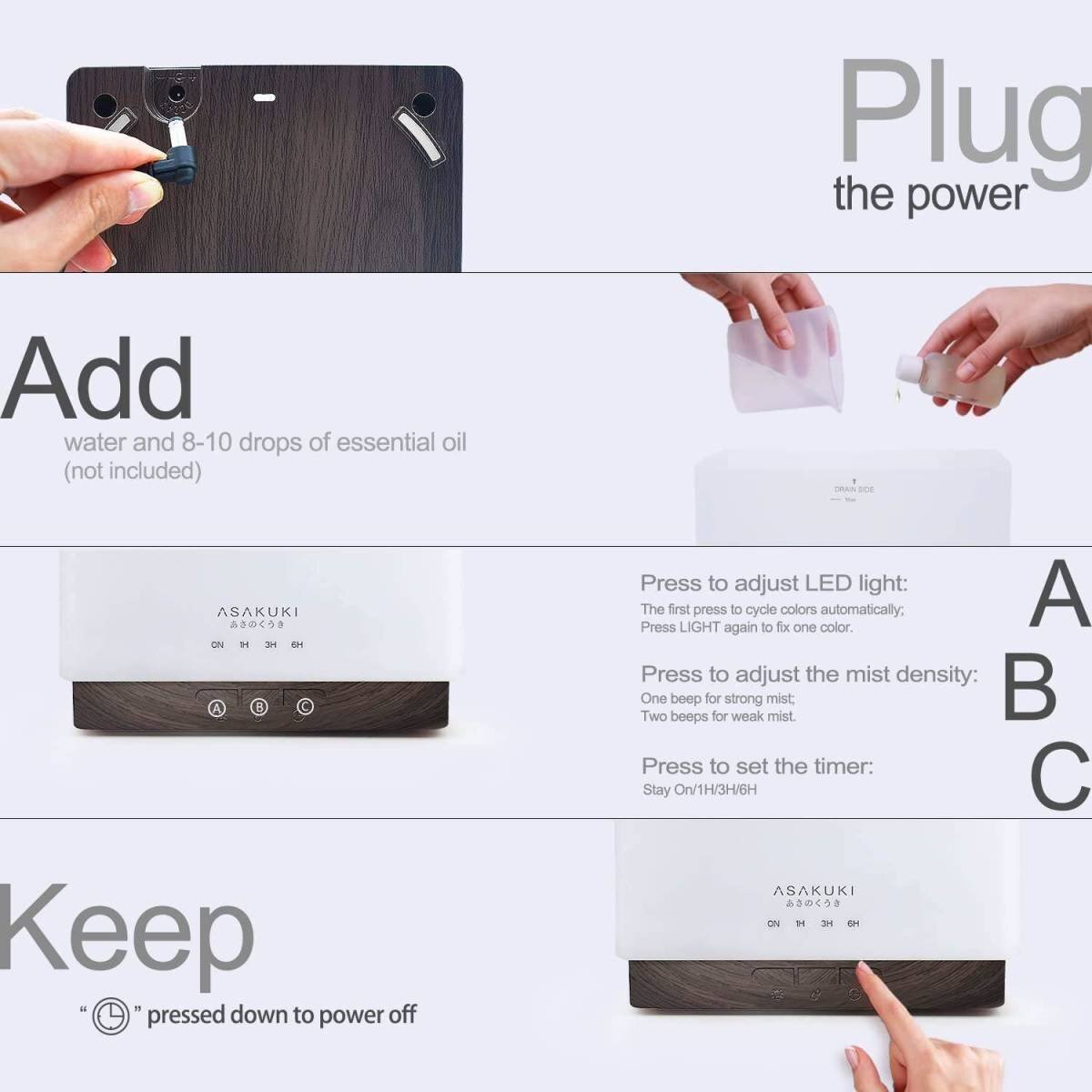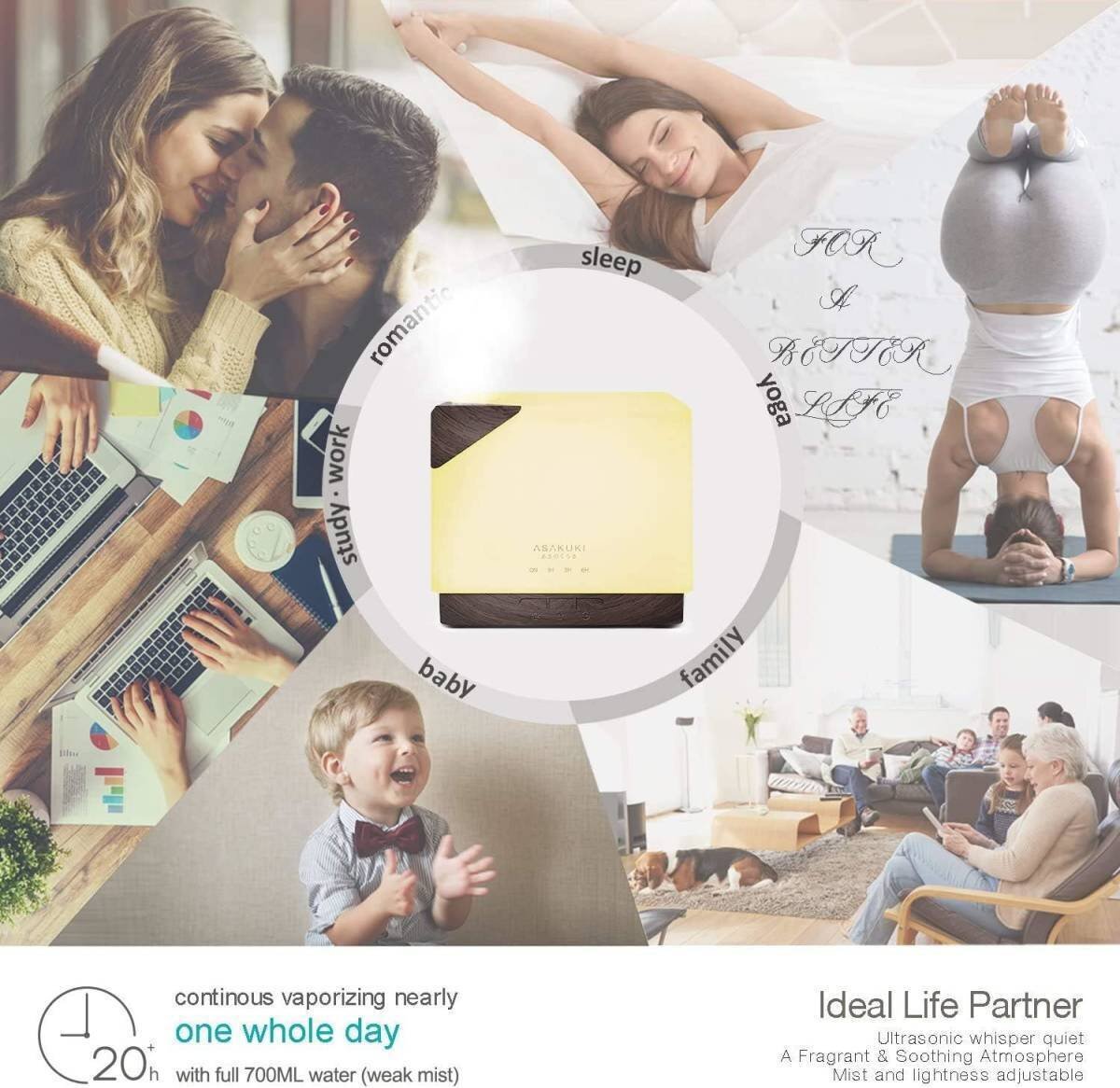 エッセンシャルオイルディフューザー ASAKUKI 700ml 5in1 超音波アロマセラピーフレグラントオイル気化器 加湿器 タイマー